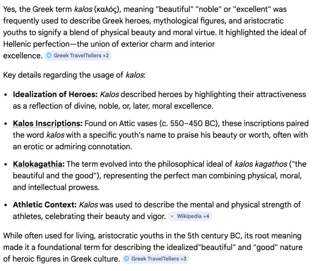 Kalōs (pronounced kah•LOHS) is a multi-faceted term that indicates beauty and physical attractiveness alongside right, valuable, and virtuous action. It was the term of choice to describe ideal specimens and epic heroes such as Hercules and Orpheus, as well as inscribed to denote the promise, appeal, and inherent goodness (— as well as lustful intent!) toward those it referred.